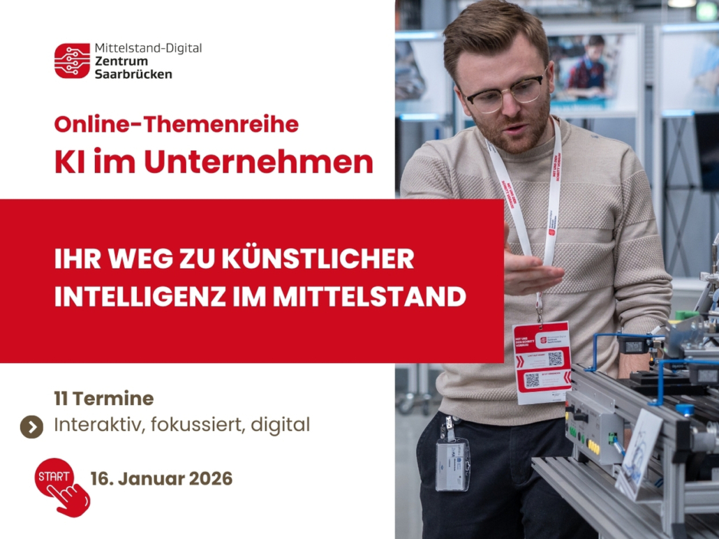 Im Januar startet unsere 11-teilige Online-Themenreihe KI im Unternehmen. Sie richtet sich an kleine und mittlere Unternehmen, die Künstliche Intelligenz sinnvoll, sicher und praxisnah in ihren Arbeitsalltag integrieren möchten, unabhängig von Branche oder bisherigen Vorkenntnissen.