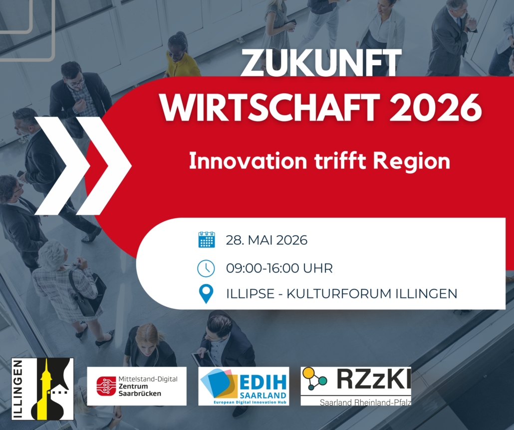 Am Donnerstag, 28. Mai 2026, von 09:00 bis 16:00 Uhr, lädt eine starke regionale Kooperation in die Illipse – Kulturforum Illingen (Burgweg 4, 66557 Illingen) ein. Die kostenfreie Veranstaltung richtet sich branchenübergreifend an kleine und mittlere Unternehmen aus Handel, Handwerk, Dienstleistung, Produktion und Büro. Veranstaltet wird das Event gemeinsam von der Gemeinde Illingen, dem Mittelstand-Digital Zentrum Saarbrücken, dem EDIH Saarland und dem RZzKI.